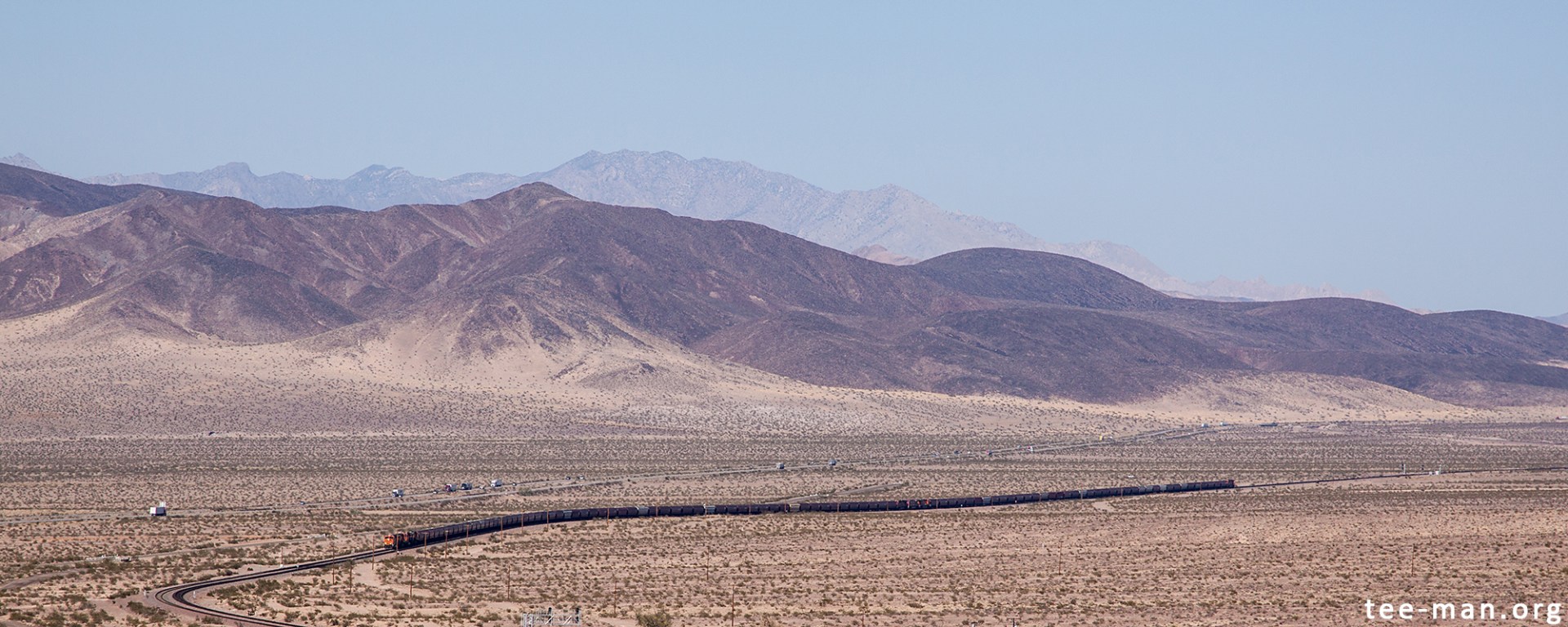 In the 1960s there exited even a project to remove part of the mountains in the background. “Operation Carryall” was supposed to blast a path through the Bristol mountains for the ATSF railroad, using 23 nuclear bombs for a total of 1.8 megatons of explosive power. The operation was part of a bigger project to use nuclear explosives for construction purposes. Fortunately, the operation was cancelled due to environmental concerns, among others. Interstate 40 in the Mojave desert was thus carved out using conventional bombs. The railroad line curves south here, running around the mountain range.