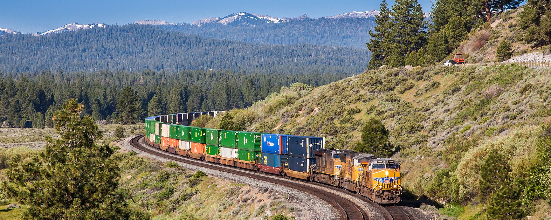 We had seen some possible photo locations close to were we had been waiting the day before, east of Truckee. We were lucky with the trains that day: after a short time the first train appeared behind the corner, treating us with this view. Notice the snowcapped mountains in the background.