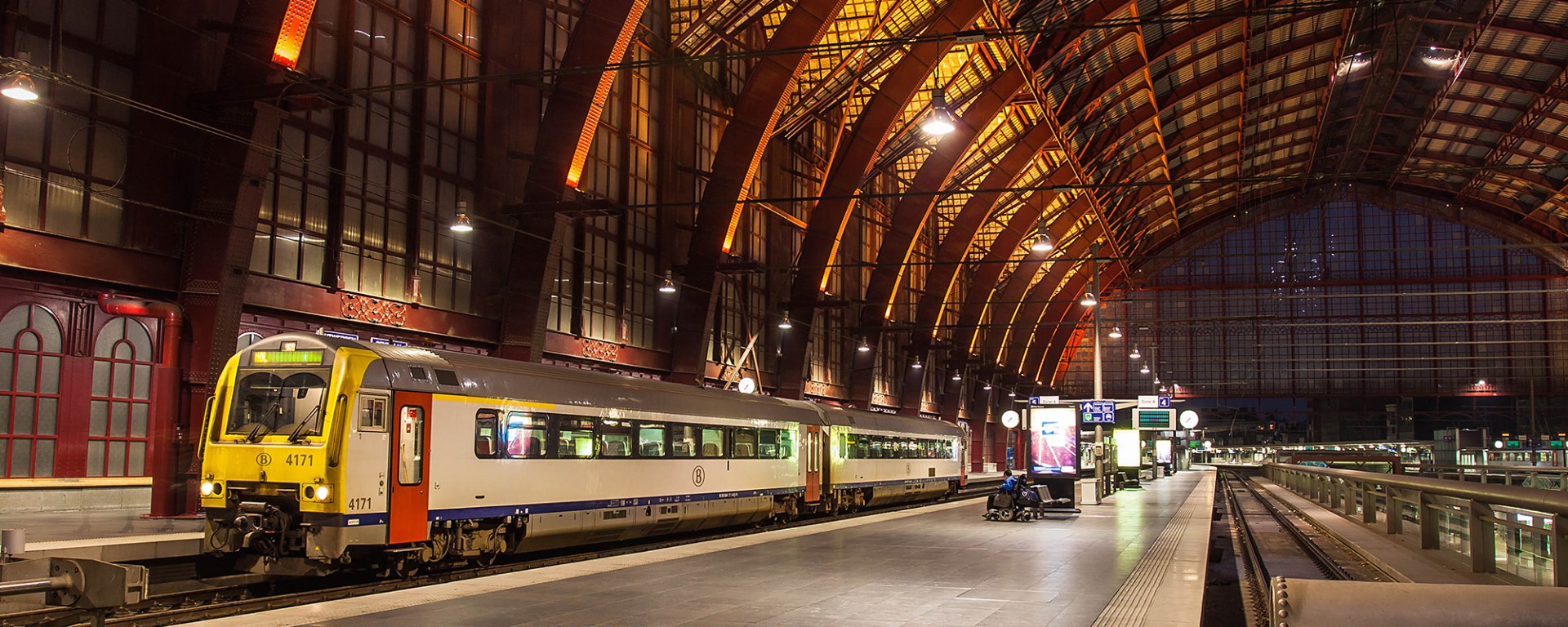 Antwerp’s Central Station was completely renovated at the beginning of the century. The historic dome and building were kept, underneath 3 new levels open to passengers were created: 1 with shops, 2 with platforms. Daylight can even reach the bottom level. On the top level, under the historic dome, the train from Mol has just arrived at its final stop. The driver will switch sides and prepare for the return trip.