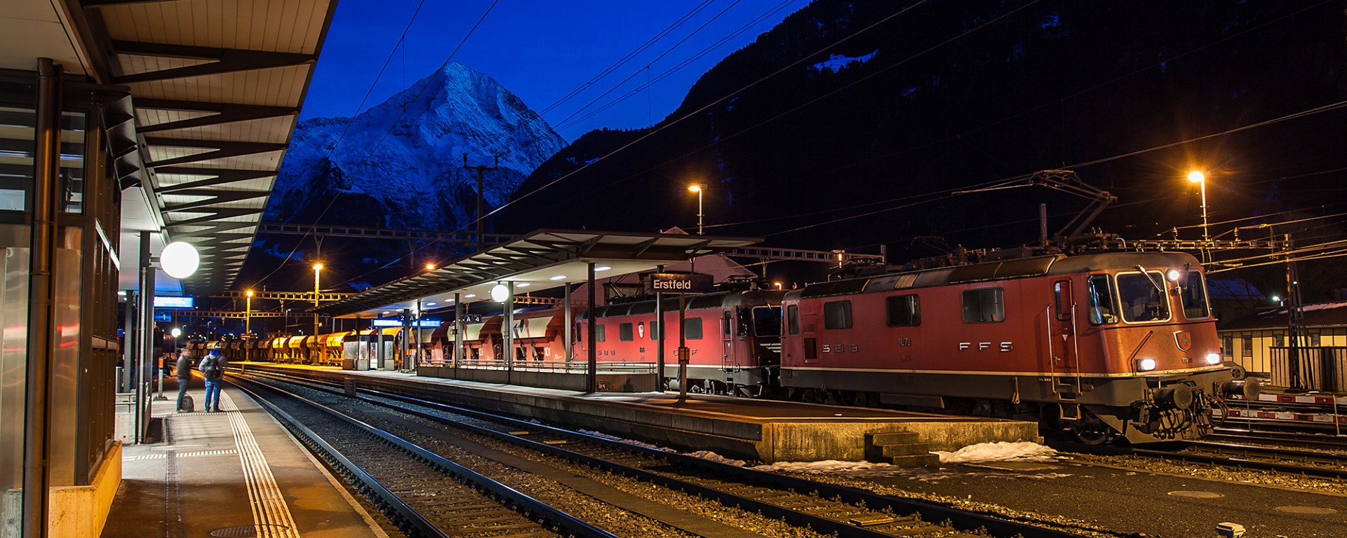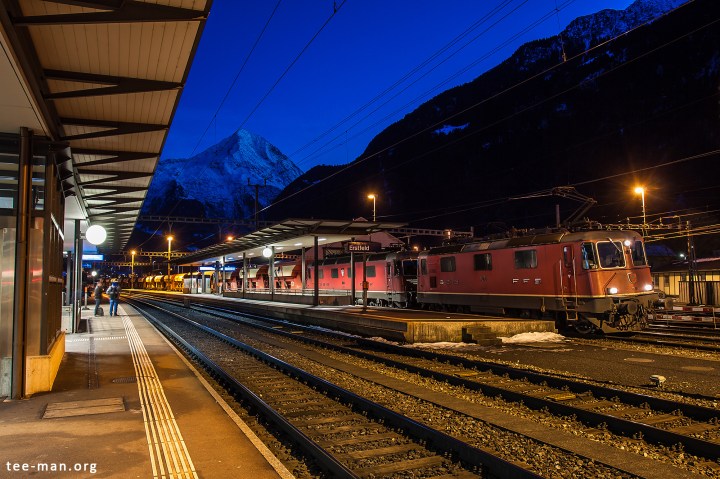 We noticed something was wrong when we didn’t see any freight movements anymore for a while. At Erstfeld, we found out there was a problem with the ETCS signalling system further down the line. Trains were being held along the line… which gave us the opportunity for an evening shot at Erstfeld station, after having enjoyed a meal at the local train drivers’ restaurant. The blaue Stunde is well underway.