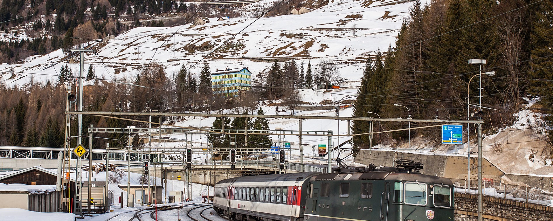 Almost an extinct species: one of the last remaining green engines in front of the regional train to Lugano was a beautiful distraction from the freight trains. It has just exited the Gotthard tunnel, highest point on the line, and will start the downhill journey to Bellinzona after a short stop at Airolo station.