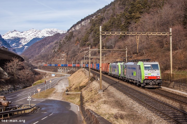 In the previous post, I promised it would be better. While driving down the mountain, temperature increased and the snow disappeared quickly. We noticed the BLS train we photographed before, riding slowly and coming to a halt. That meant we had a chance to get a better picture of this train. We chose a famous location, but one I hadn’t been to before. And yes, after the passenger train we only had to wait a couple of minutes to see the BLS train slowly come around the corner.