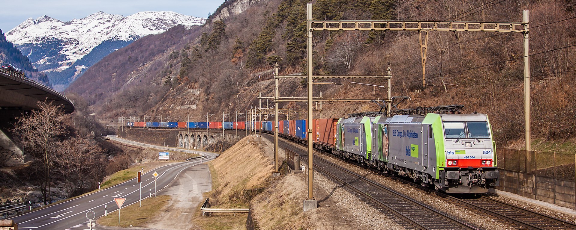 In the previous post, I promised it would be better. While driving down the mountain, temperature increased and the snow disappeared quickly. We noticed the BLS train we photographed before, riding slowly and coming to a halt. That meant we had a chance to get a better picture of this train. We chose a famous location, but one I hadn’t been to before. And yes, after the passenger train we only had to wait a couple of minutes to see the BLS train slowly come around the corner.