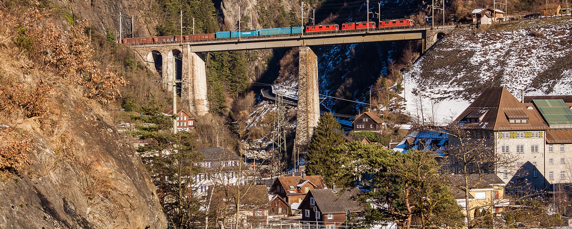In our search of sunlight and snow, we ended back up on the north side of the Gotthard pass. The viaduct at Amsteg would get some of the latest winter light. It is located high above the small town. When the train exits a tunnel it enters the bridge immediately. Check out this alternative view: it shows it more clearly, from the other side. For this take we got some more sunlight than the year before, and a bus that passed accidentily at the right time.