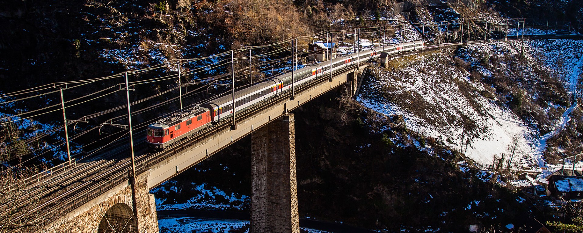 Backlight is perfect for the last shots of the day, with low sun. Like the day before, we ended up standing above a viaduct, with the sun in front of us. The hike up here and the view were how I like them best: steep and scenic. The bench made for a comfortable wait.