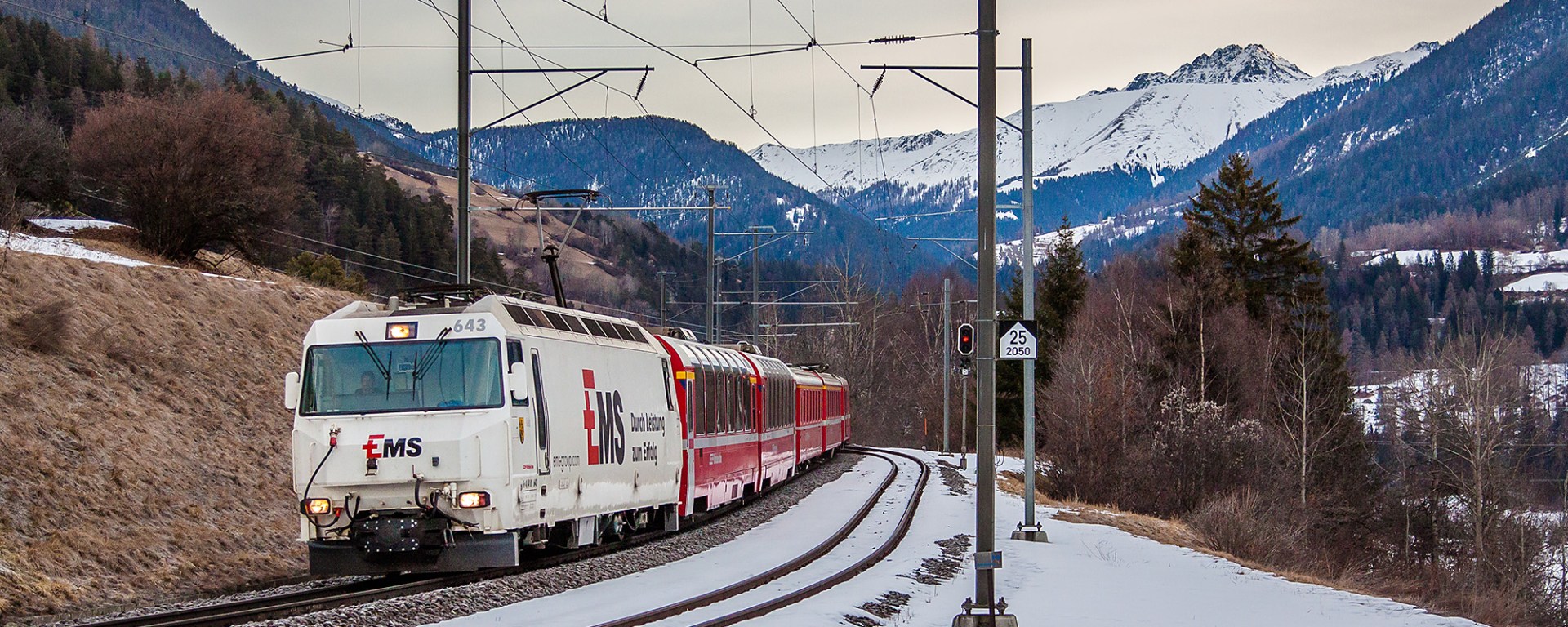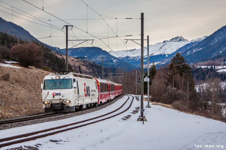 Rhätische Bahn makes available its timetable, which includes the freight trains. A blessing for railfans. We awaited the first freight train in Alvaneu. First train we saw was the regional express from Sankt Moritz to Chur, hauled by one of RhB’s most recent locomotives. It’s promoting EMS, a company specializing in high performance polymers and specialty chemicals.