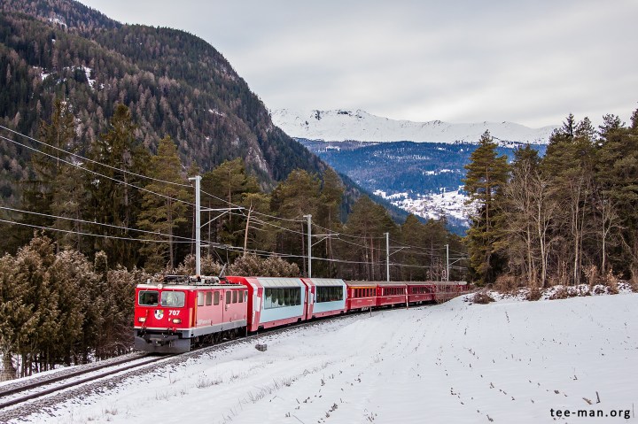 Back to Alvaneu, where we were just in time to catch the Chur – St. Moritz train, hauled by Ge6/6 II n° 707. The train is composed of 2 first class panoramic coaches, one regeular first class coach and some second class coaches.
