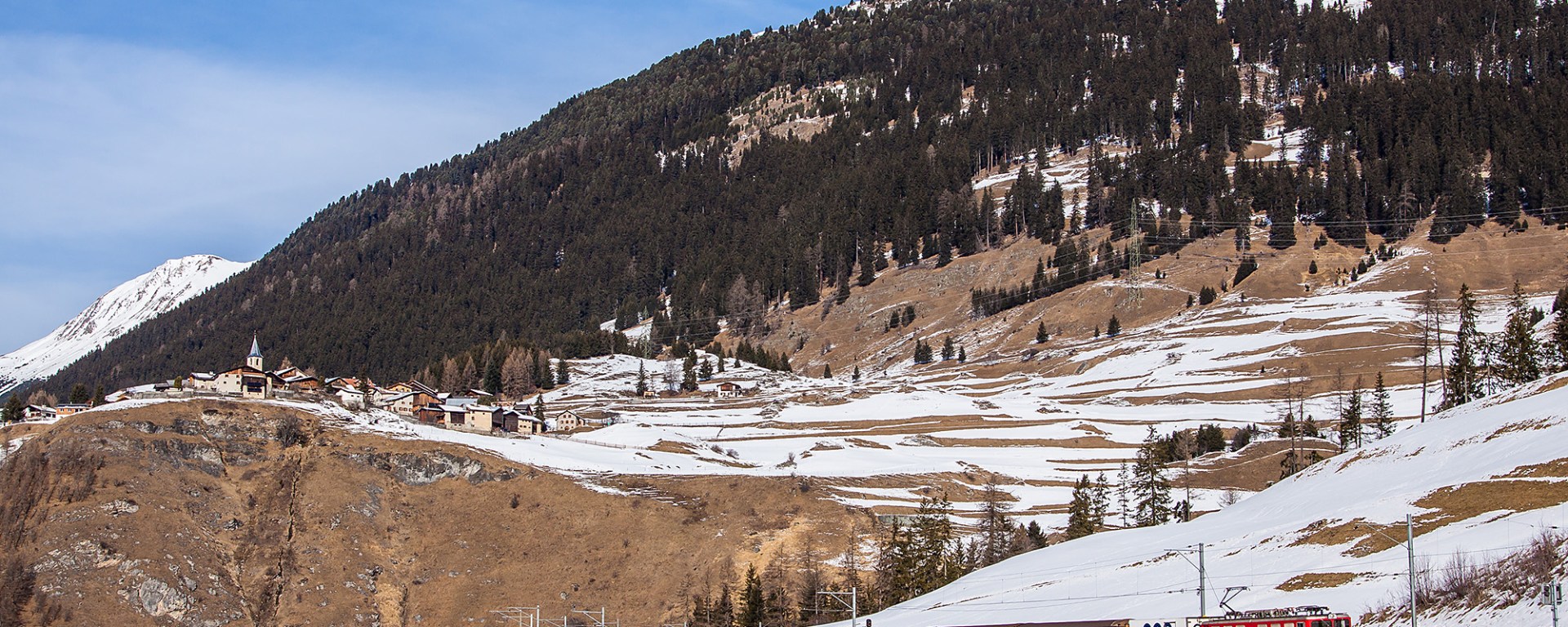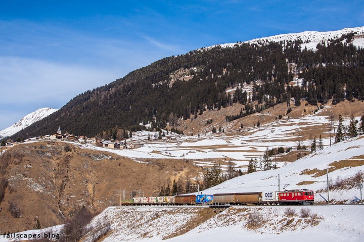 Sledges are dangerous. Trust me. I would experience that in person in a couple of hours – at this moment we were only making sure not to be hit by one coming down the hill. With success, fortunately. All to get a nice view of the Samedan to Chur freight train. Towering above it all is the town of Latsch.