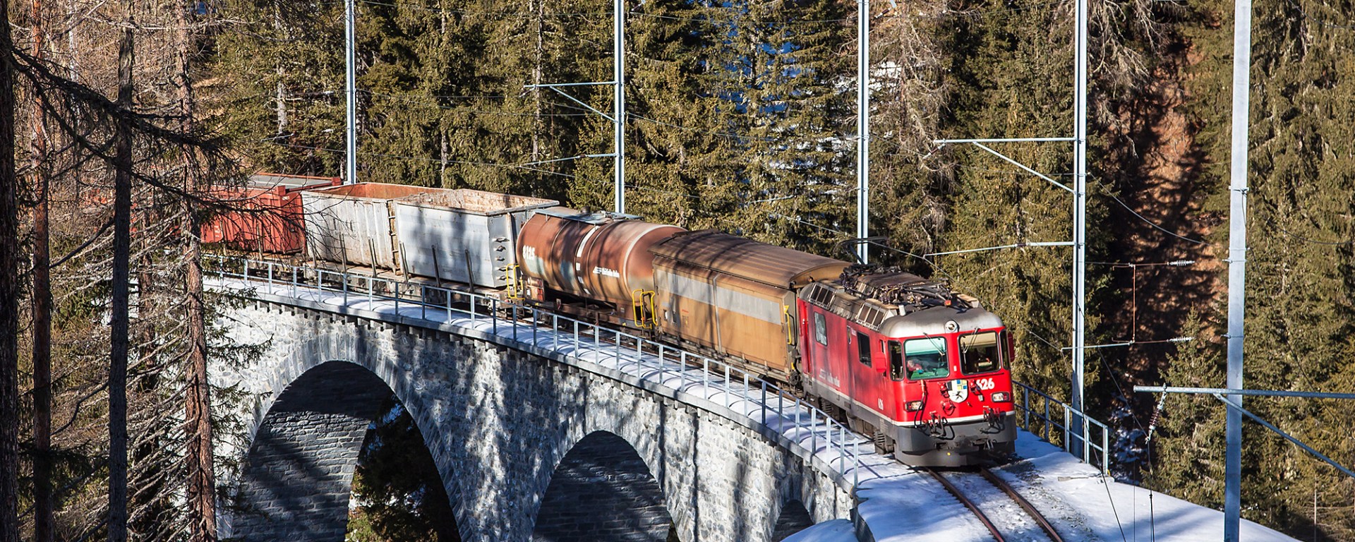 The search for photo opportunities became harder as the forest became more dense. No big deal though, getting there is half the fun; that is one of the reasons this hobby has become a passion. Right on time for the next freight train up the mountain we found this view on one of the Albula railway’s many typical bridges. Loco 626 is in charge of getting the cars to Samedan.
