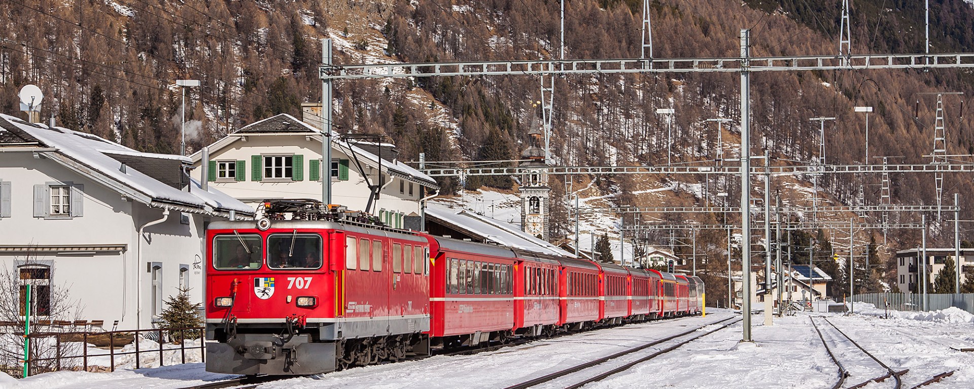 Human beings have autopilots when it comes to doing what you really want to do. And so I was able to continue making photos, albeit a bit slower than before. We were expecting a freight train to Samedan and decided to wait for it at Bever station. We also knew from yesterday’s observations that the next train from Chur could be hauled by a mighty Ge6/6 II engine. Our memory served us well, as in warm sunlight we saw number 707 of the aforementioned class enter the station.