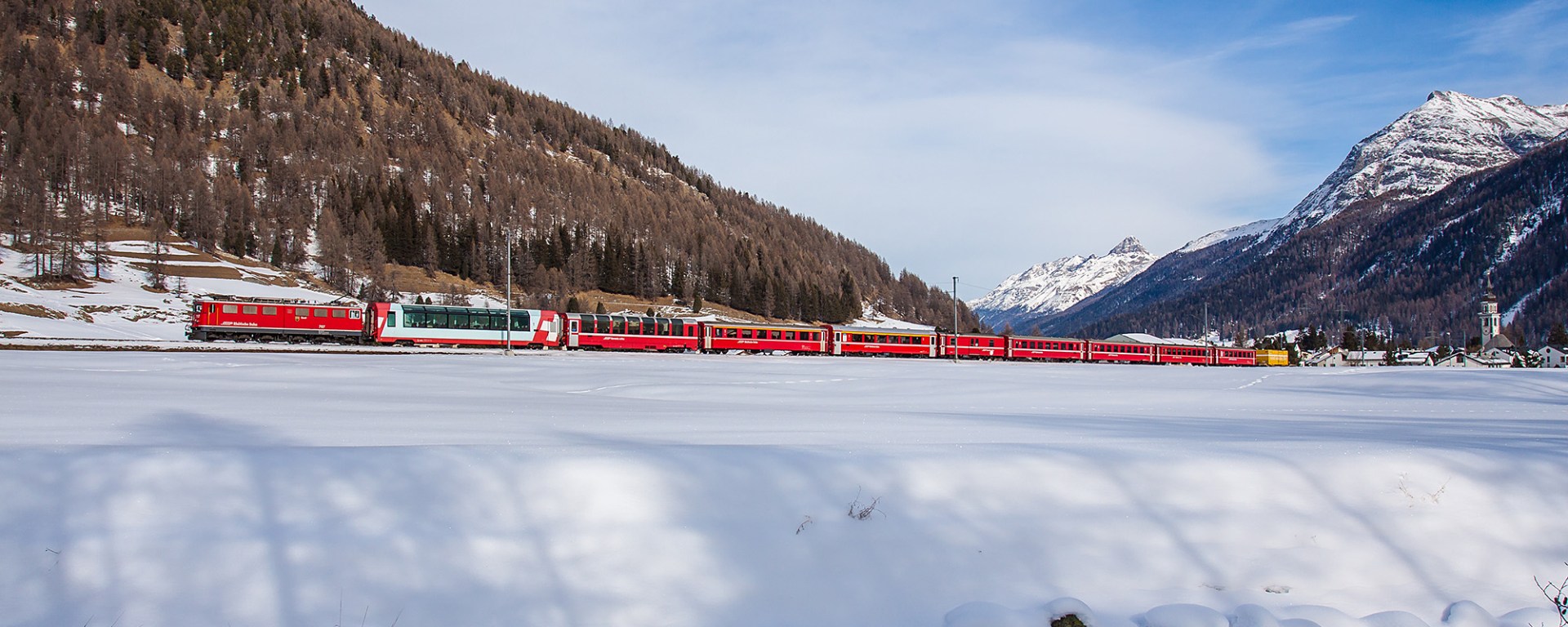 We stayed around Bever for the next freight train, but decided to head to the beginning of the Albula line. First train we got was this RE to St. Moritz, hauled by a Ge 6/6 engine. Notice the mail car at the rear of the train. In the background, the town of Bever.