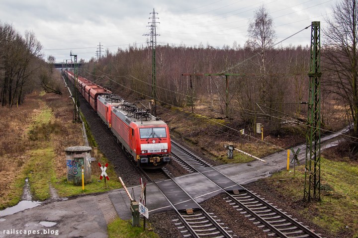 A railway crossing in the middle of nowhere, right next to an abandoned bridge and railway bed, seems to be a preferred spot for local painters. This adds to the already abondened feeling scene, which probably looks and feels a lot different during another season. I still find the view from this side of the bridge quite fascinating. I also like the modern train in it, but it would be cool to get a vintage looking model here one day: it would send you 20 years back in time.