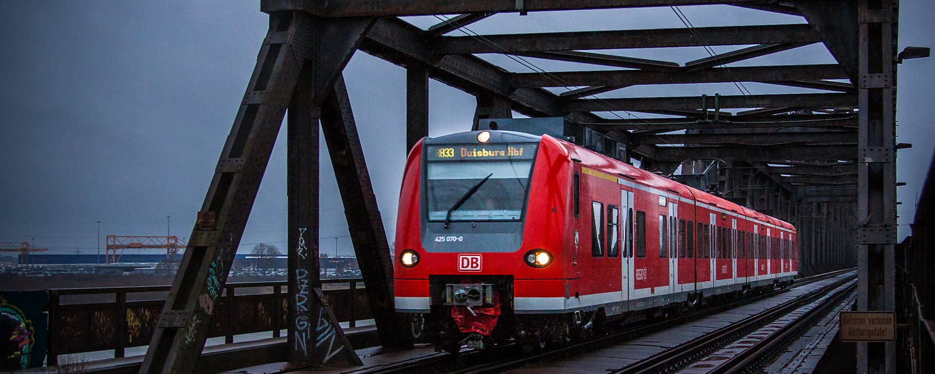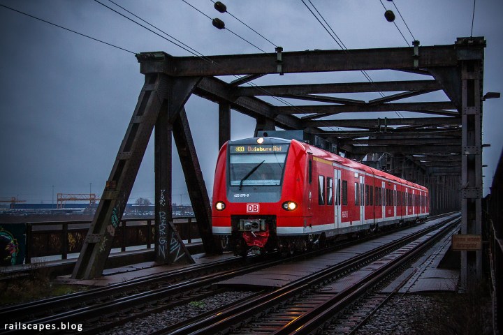 The gloomy and short winter day ended at the monumental bridge over the Rhine river at Duisburg. I squeezed the camera through a fence to get a decent view on the steel monster, hoping for some freight but getting a bright passenger train. Nicely contrasting the bridge. It was only getting darker and I was getting more and mmore soaked and cold: the signal for me to return home.