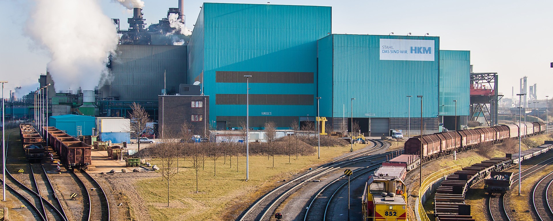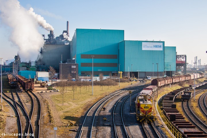 Eisenbahn und Häfen Gmbh, part of ThyssenKrupp, is in charge of the shunting operations. Pictured here is one of the company’s 6 Krauss-Maffei MH05 engines. It is pulling a string of cars for transporting steel coils and steel sheets out of the factory. On the left we see cars filled with metal scrap, to be recycled in the ovens in the background.