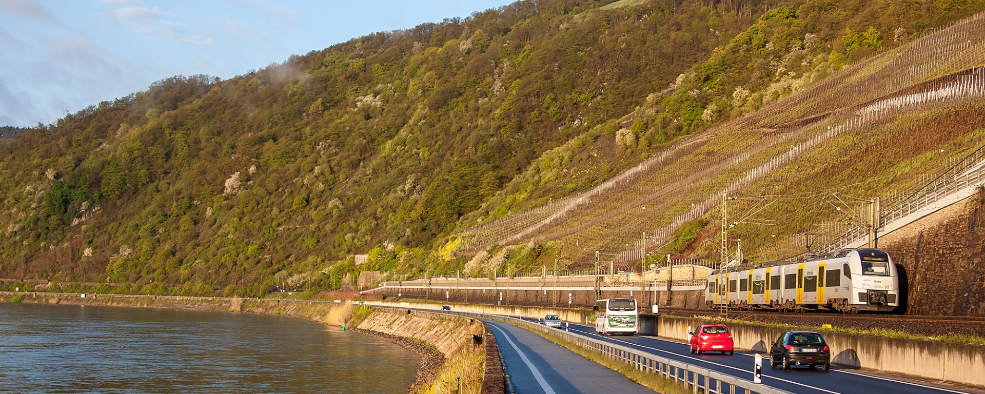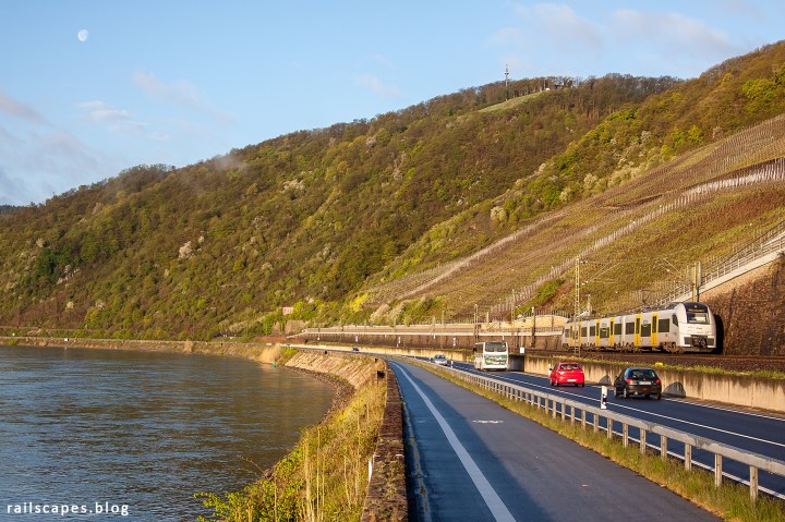 A bit more than 10 minutes after the previous shot, the valley was bathing in the first sunrays of a pleasant spring morning. The peace was shortly interrupted by a Transregio Desiro on it’s way to Mainz, racing with a few cars to get to Boppard first. I would continue chilling out on the little wall for a little longer, enjoying spring.