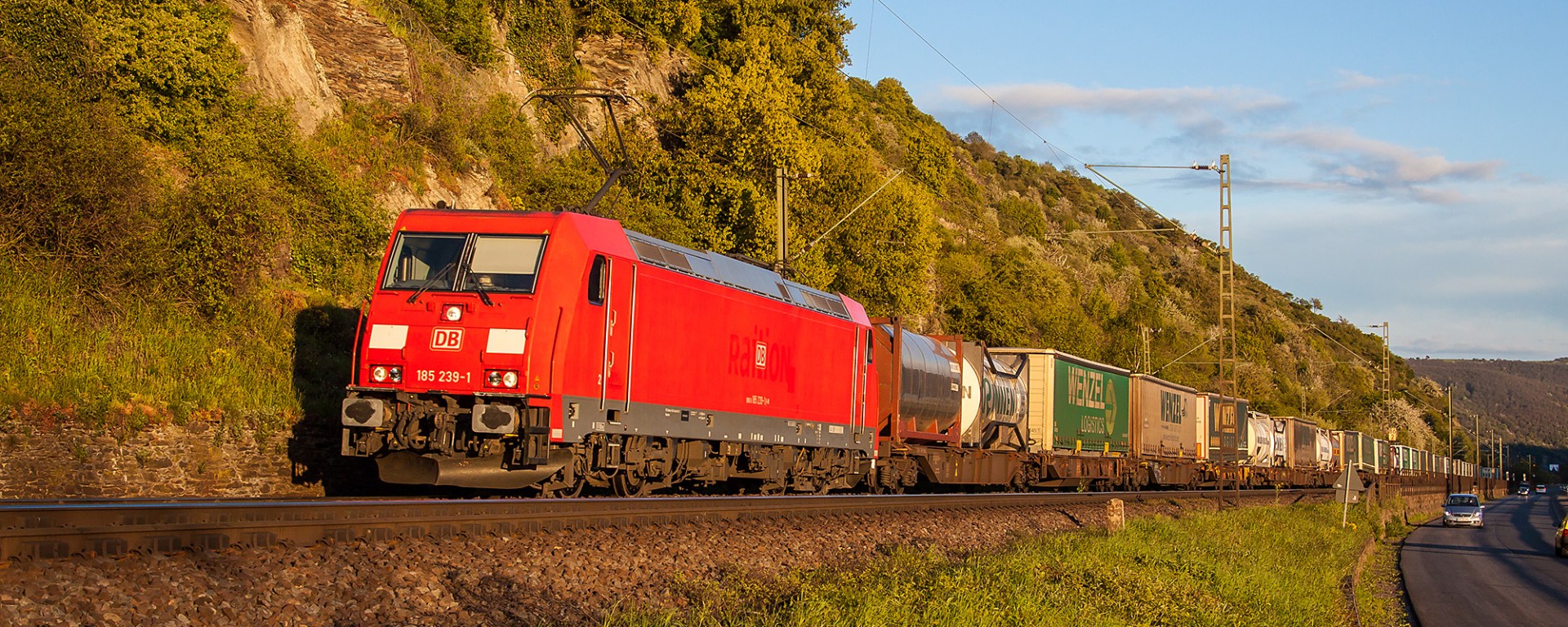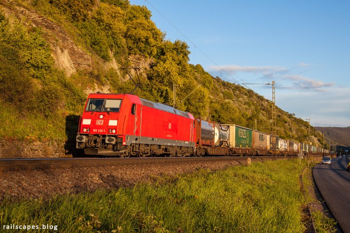 I was feeling like ending this beautiful day in a good way, enjoying the last rays of sunshine, before driving back home. Not a lot beats sitting at a quiet place with sun heating up your body. The place I found did not really qualify for the quiet criterium, right next to the road, but considering it was only april there wasn’t all that much traffic. I was lucky, because this evening I saw a lot of northbound trains at the exact right time. Only minutes before shadows started eating away the foreground I got this nice looking Traxx engine hauling containers along the right bank of the Rhine river; it’s bright red livery contrasting nicely with the warm green of the bushes.
