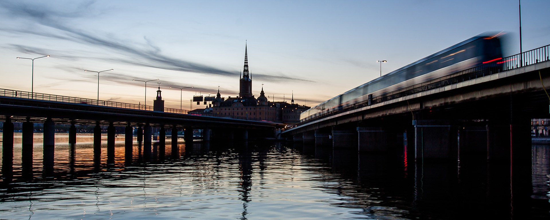 With the tower of the Riddarholmskyrkan in the background, a C20 type subway train of Storstockholms Lokaltrafik, the company responible for managing Stockholm’s subway system; is headed towards the city’s main train station.