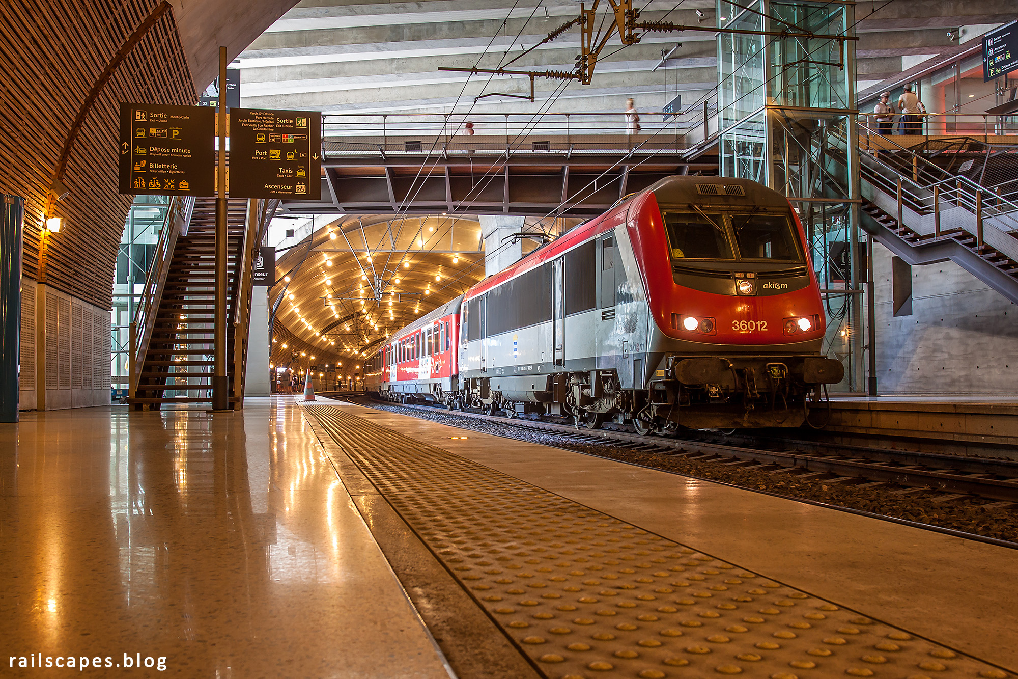 The principality of Monaco has its own railway station. It is hidden well beneath the glamourous outside world, but of course features a healthy dose of bling-bling. Monaco even owns a few trains, easliy distinguished from their SNCF-sisters by their red livery.