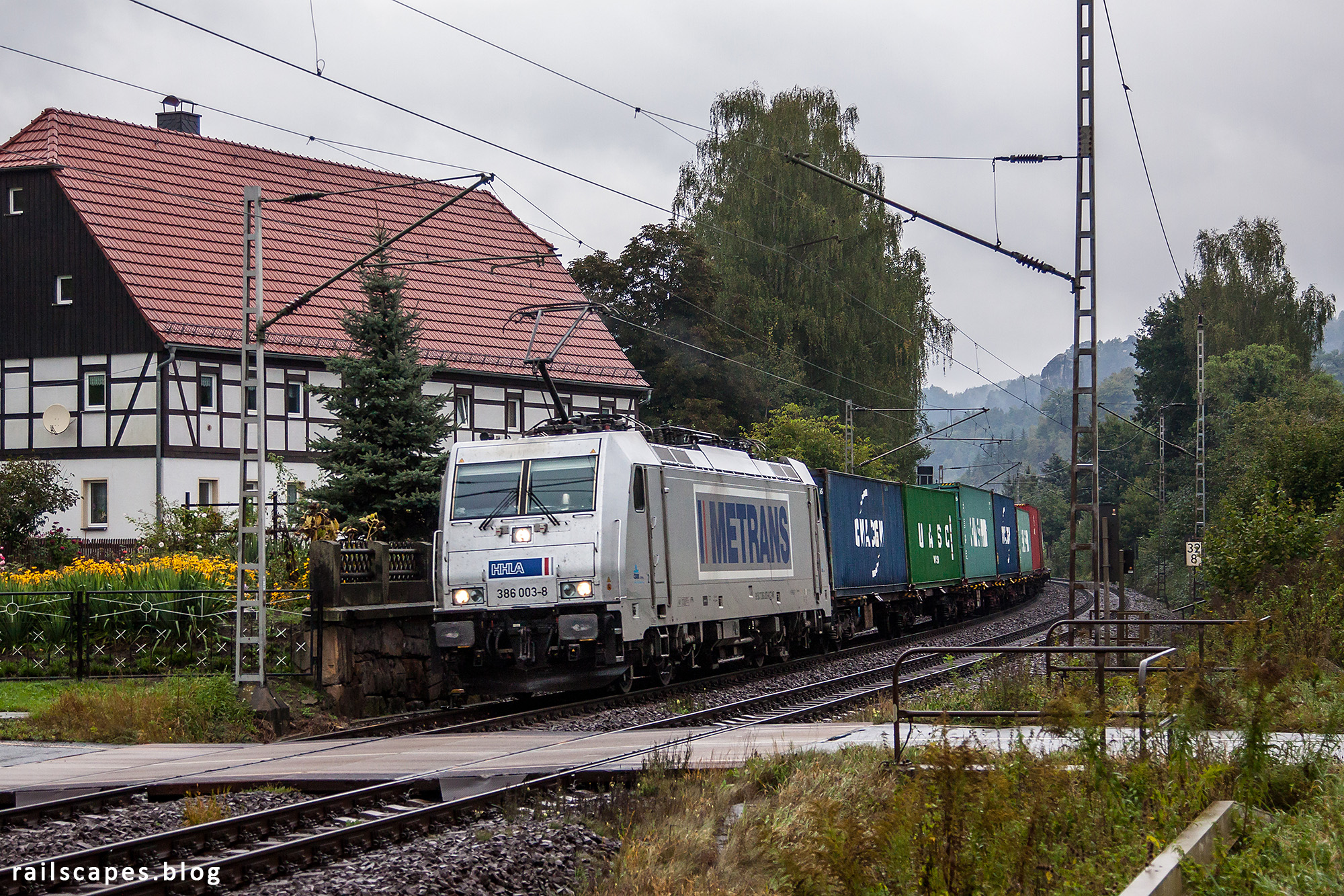 Today, Metrans is operating 30 Bombardier Traxx MS2e engines. This year, another 10 identical locomotives will be added to their fleet. On september 19th I could make my first photo of one of these engines – the line along the Elbe sees a lof of Metrans trains, no particular accomplishment there.