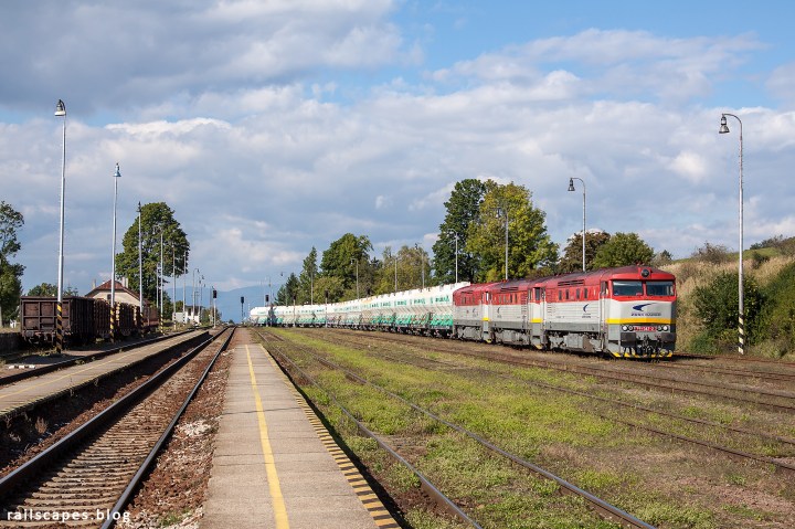 Back to Horna Stubna, to check what action can be expected next. THere was not much asking involved, as we saw this train running into the station. This is the train I came to Slovakia for: cement train 55721 from Lietavská Lúčka to Zemianske Kostoľany, pulled by 3 Bardotka engines. Some people see a similarity between the locomotive’s nose and Brigitte Bardot, hence the nickname.
