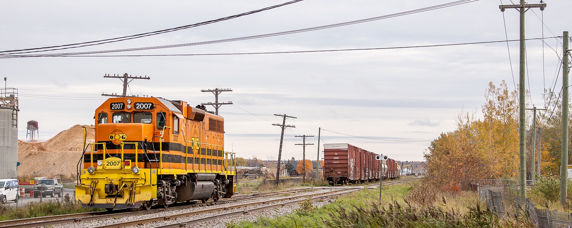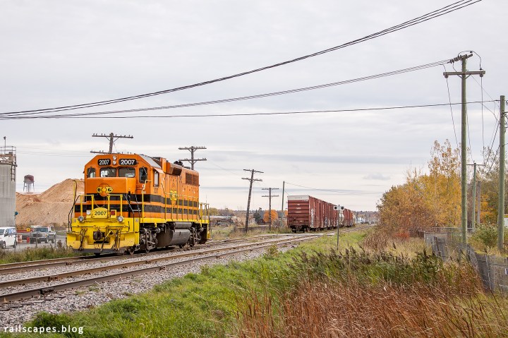 Some bright orange between trees and barns was all I needed to steer the car to a side road. GP40-2 number 2007, in Genesse & Wyoming scheme but running for Québec Gatineau Railway is waiting for its next duty.