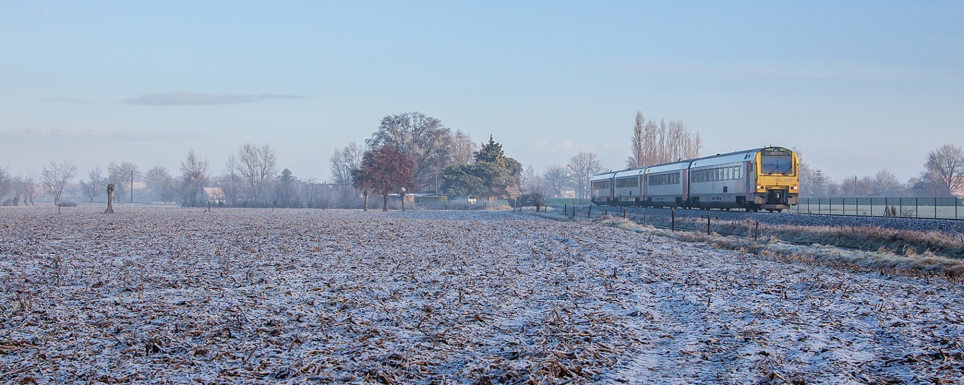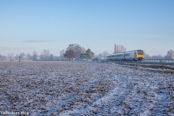 The sun is rising slowly above the frozen fields, that will slowly warm up and lose their white tint. A typical view on regional non electrified lines in Belgium since the early 2000’s, but wintery scenes like this are still very enjoyable.