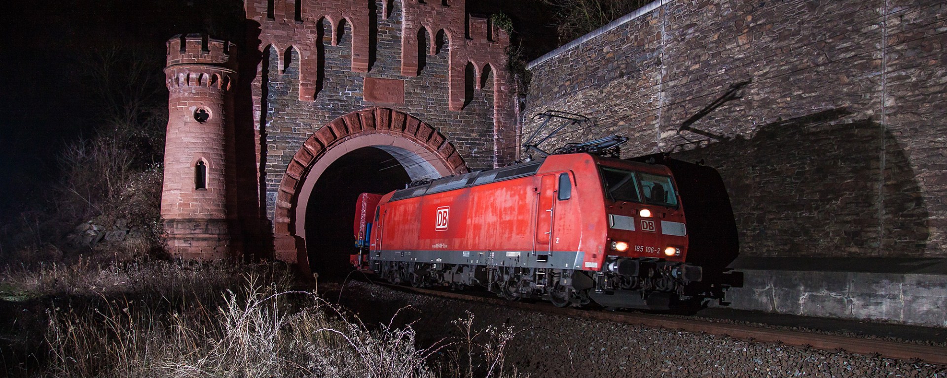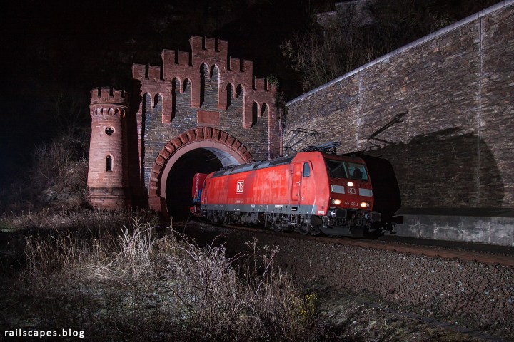 It was cold, freezing cold. But we really wanted to get this shot. We were two, and unfortunately we couldn’t find a way to trigger two a camera’s at the exact same moment, so we took turns taking photos. The one not taking the photo, could then also hold another flash in position. This is one of the shots that I got. A BR185 TRAXX locomotive was very briefly lit up under the ink black sky.