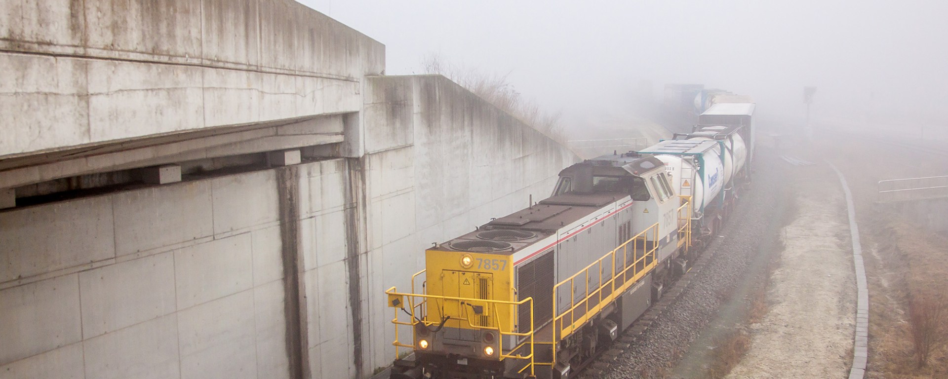 Through the fog I managed to find a way to the bridge over the outer end of the Zandeken yard. An earlier attempt to photograph the train in the fog failed completely, as the train was just not visible. Close to the bridge, visibility was a lot better.