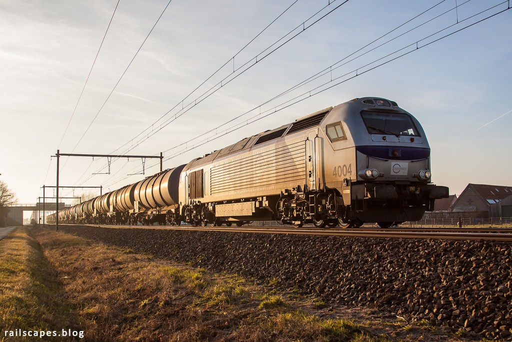 Returning to my home town after a short photo trip, before turning into my street, I saw some freight wagons standing still near my house. It turned out that one of the wagons had a problem with the brakes. The train driver got it fixed, and got the train back moving when I arrived on the spot. This location has changed quite a bit: as part of the modal shift from car to bicycle, a bicycle highway was built here, together with a fence.