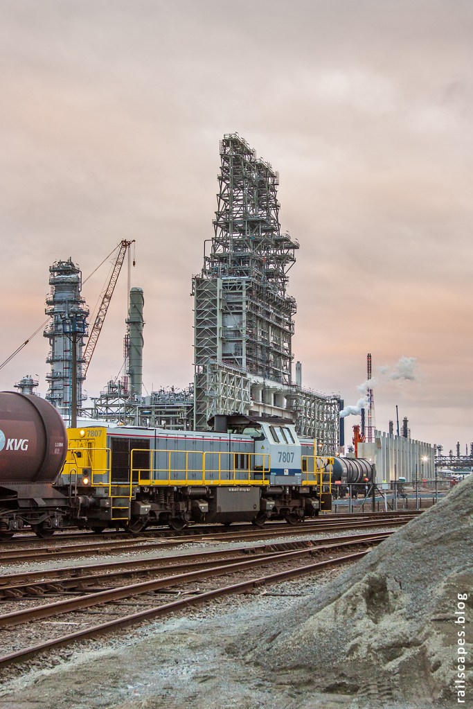 From the Ijsland section, locomotive 7807 continued north, towards the Petrol section. Interesting, maybe the crew was going to pick up a train. I caught them back at the outer end of the Petrol shunting yard in a setting that makes it easy to see where the shunting yard got its name.