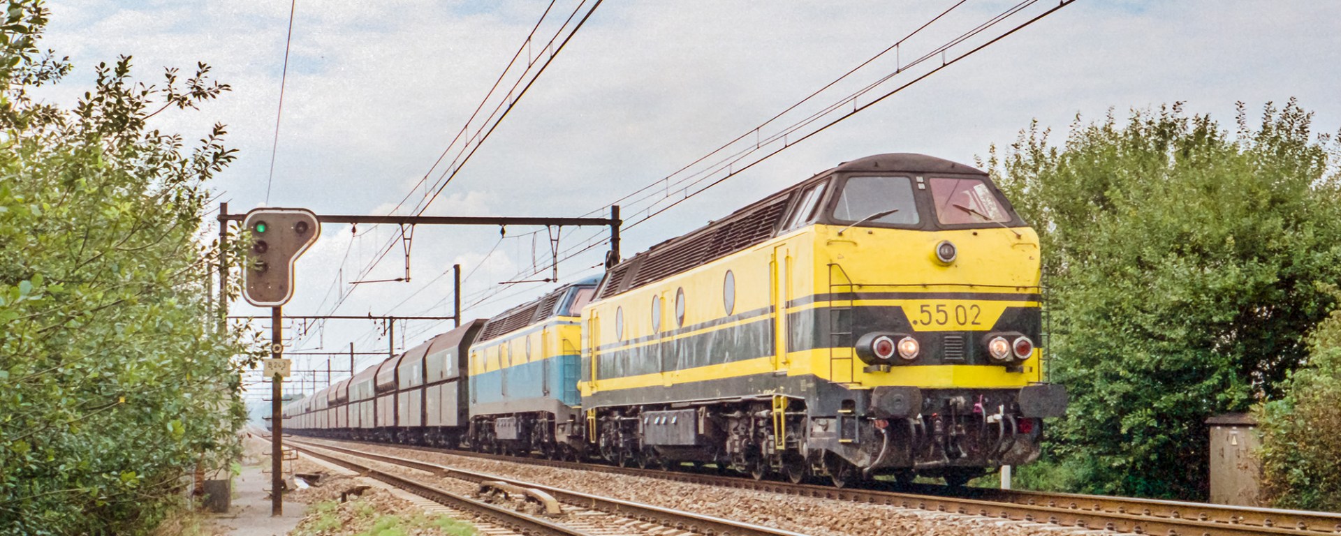 At the time this photo was made, diesel traction between Liège and Luxemburg had ended only a few months ago. As such it become more usual to see blue 55’s on freight trains, as proven by this example. With a heavy coal train to Germany, sisters 5502 and 5519 are singing loud to pull it up the hill.