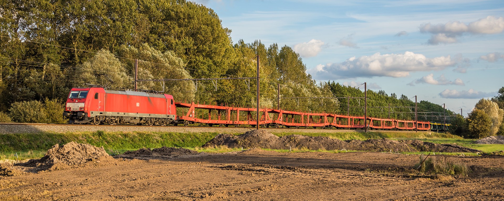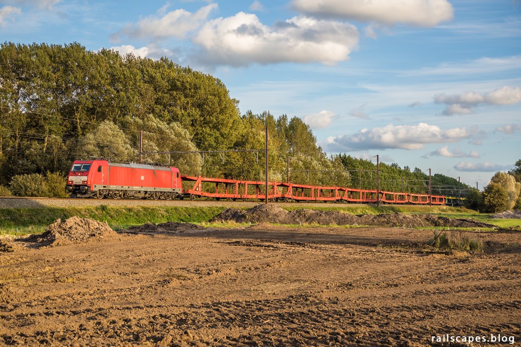 A heads-up right on time, at the end of the working day, made this picture possible. The photo location in Oostkamp has changed a lot, construction of a new industry zone is oingoing. Catch them wile you can, although this autumn was probably the last one that we could easily photograph a DB TRAXX locomotive heading towards Zeebrugge, as DB has just started commercially operating their Vectron locomotives.
