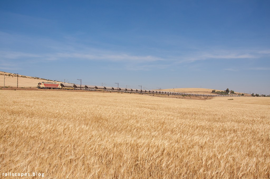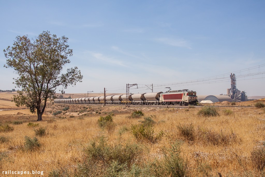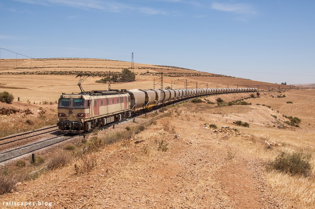 We made the first pictures at Mrizig, west of Khouribga. The bumpy road was perfect to wake up – no road too rough for our Romanian rental car. Next we moved towards Ras El Ain and Settat, where we found numerous photo opportunities. Trains were operated by a mix of French (Alstom) and Japanese (Hitachi) built locomotives.