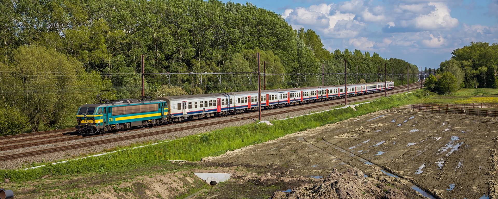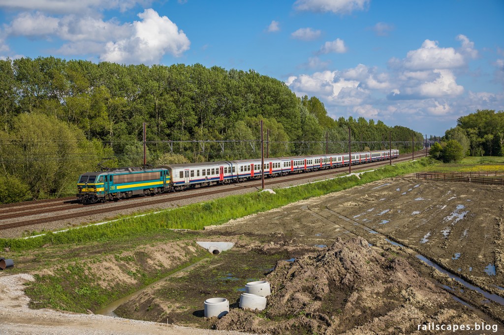After almost 2 weeks of overcast weather and rain, I all of a sudden noticed the sun shining through the window. Finally. According to the satellite images, clouds would stay away for a few hours, meaning the opportunity was born. No freight on the way, but 2 interesting passenger trains would be worth the effort. Both connecting Schaarbeek and Oostende, both running with 80’s coaches (slowly becoming rare!) and one of them even with a vintage 21 series locomotive. Vintage, yeah… 40 years, I call it the spring of life.