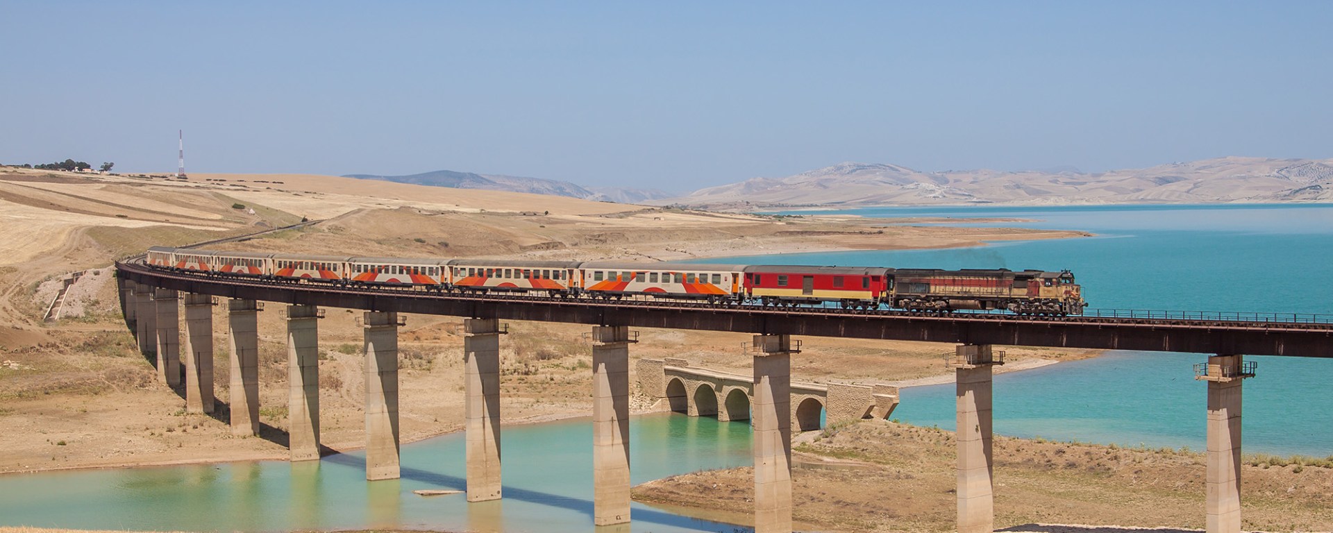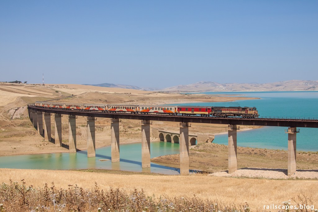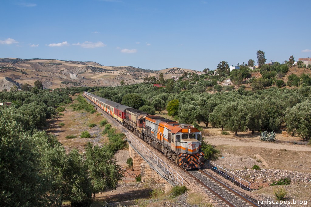 After a refreshing night in Fès – I love riads – we left for a full ay along the diesel line bewteen Fès and Taourirt. Weather was looking great and we headed straight to the region where we left the day before: the barrage Idriss 1ier. The chosen photo location was top class. Blue lake, hills, and underneath the recent bridge you can see the bridge of old alignment of the railway line. What will make us remember this location even more, is the encounter with a railway employee while waiting for the train. Very friendly man, and once he learned that we’re Belgian, he started shouting “Roi Baudouin”. Constantly. Even from inside the bridge deck, where he had to work. Hilarious :).