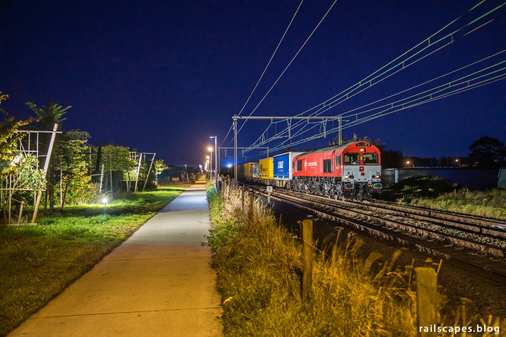 This was a very ice photo to make. Getting the gear set up using feeling only, tweaking location and gear until things were the way I wanted them to be. During all this time, no bike or pedestrian came by. It was perfect to get into it again. The train pictured was the most interesting one of the evening. Hauled by a mainline diesel (who knows how long this will last), it connects the Kluizendock in the port of Ghent with Mortara in the north of Italy. It’s usually a colorful and well loaded train, no exception today.
