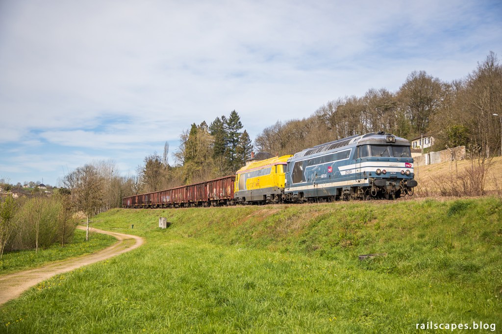 I first went to Aixe-sur-Vienne, so that at least I didn’t need to worry about a photo location. There were still high clouds, and my 2-step ladder was not high enough. As climbing a tree was not an option, I had to settle with a lower view point. After a while, I heard the sound of C. SNCF passed me at the expected time, with a blue BB67400 heading the train. Now I could only hope for the second return trip to ride today.