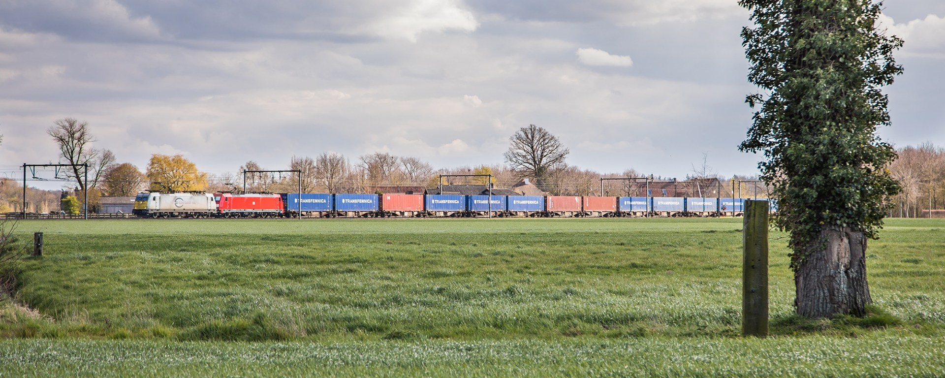 Detours are a good means of making photos on lines where usually only few freights run. Seen here, a Transfennica train from Bayonne to Antwerp rerouted via Brugge. The locomotives will run arund here and continue the journey to Antwerp. Seen at Loppem on April 12, 2021.