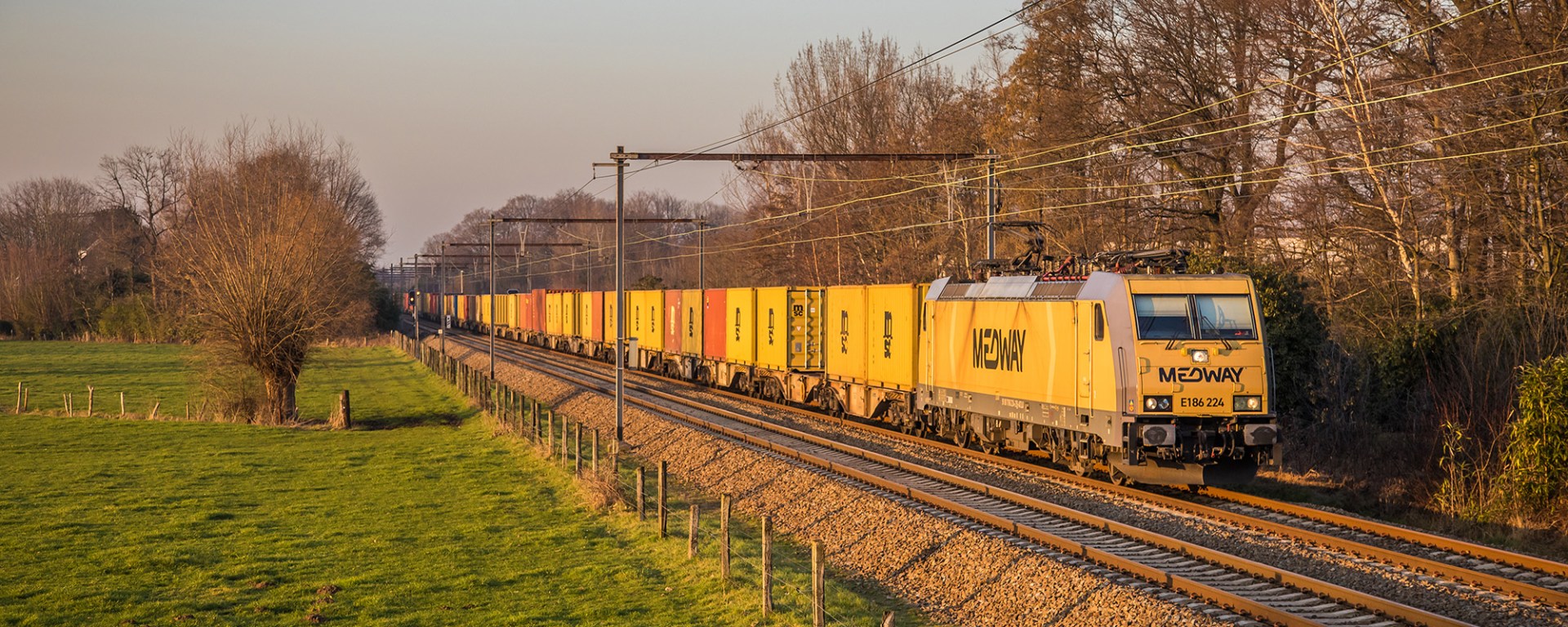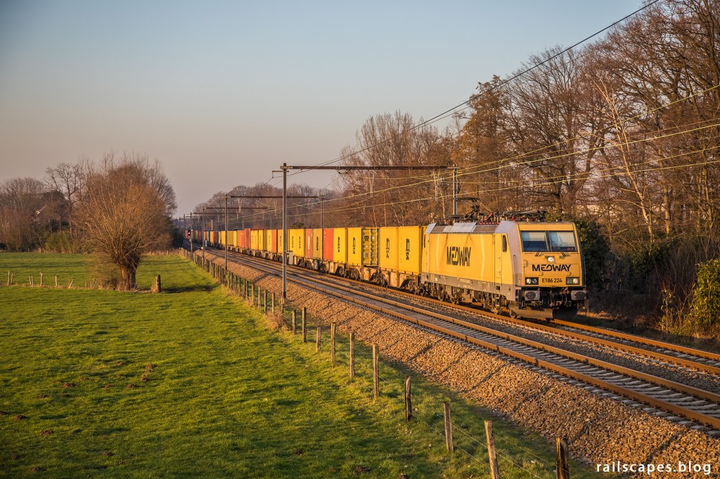 Medway’s Neuss to Antwerp container shuttle for mother company MSC was right on time to enjoy some early spring sunshine. A few more kilometers to go before it has reached its final destination, it passes through this rare rural lap of ground just north of Antwerp.