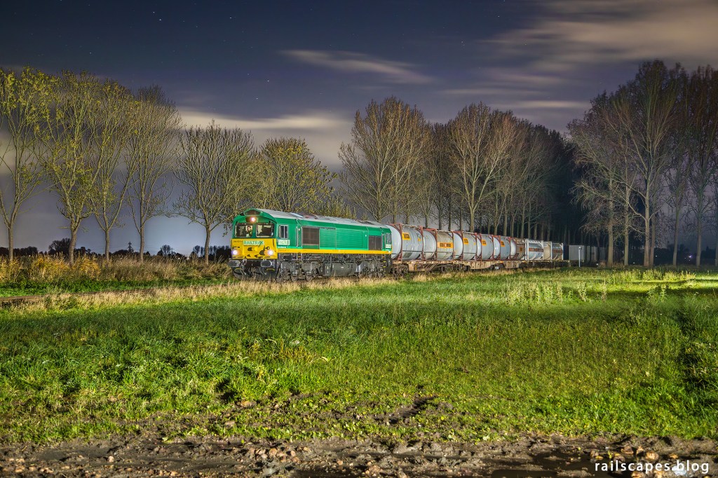 The Bertschi train from Sluiskil to Antwerp has become less visible again due to, well, no convergence between it’s timetable and the seasonal position of the sun. So I had to bring my own light to brighten up this chemical train. Talk about artificial.