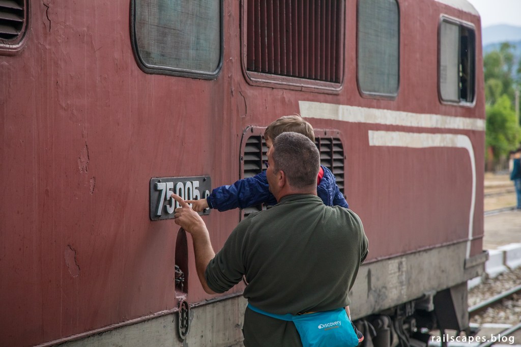 In Velingrad, the uphill train had to wait for the downhill train which was running late. This made some time for us to check out the atmosphere in the station, and for the locals to teach their children about trains. When the train to Septemvri finally came in, it turned out it had hit a tree a bit earlier, which smashed one of the front windows. The train crew used the stop in Velingrad to clean the debris off the locomotive, and to prepare it for continuing its trip. It probably helped that the train was reinforced due to Gergiovden (day of the courage of the Bulgarian army) and that it was carrying the Bulgarian flag. But still. I can’t imagine this to happen in our region. So we also got some pictures and a little movie of the train running to Septemvri, in the pouring rain and without front window.