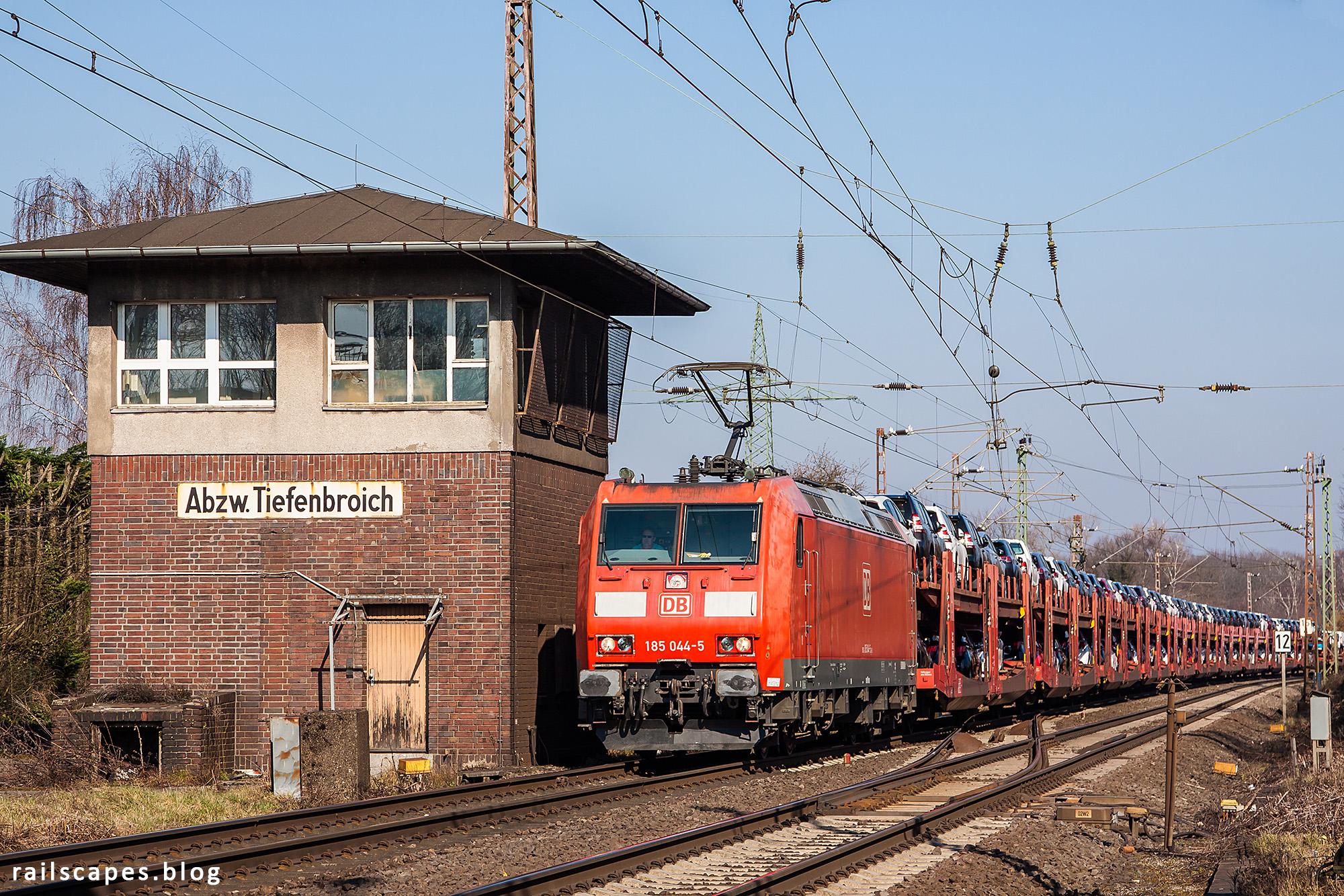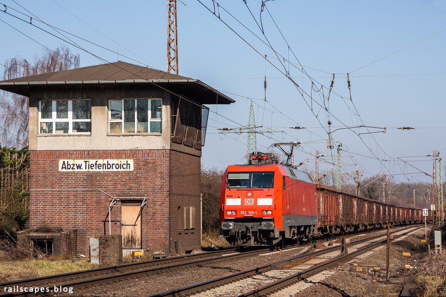 Next on the list of places to visit was the freight rail line from Duisburg to Düsseldorf. There still exists an old signalling cabin at the Abzweig Tiefenbroich: here, the Angertalbahn to Wülfrath splits off of the main tracks. The 3 photos below passed in a timespan of only 20 minutes.