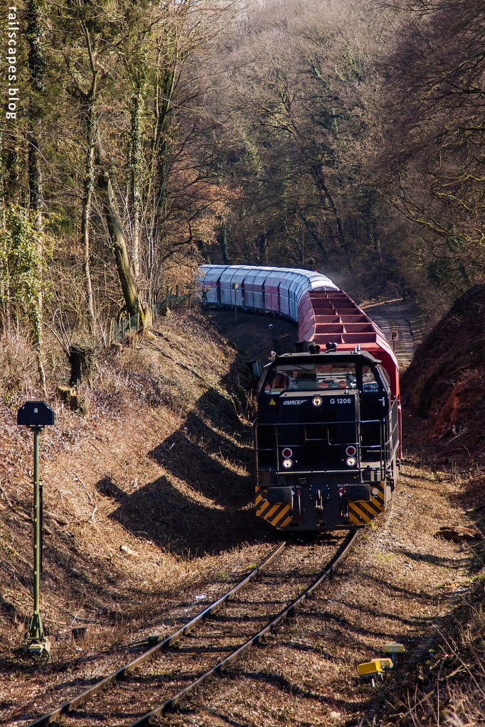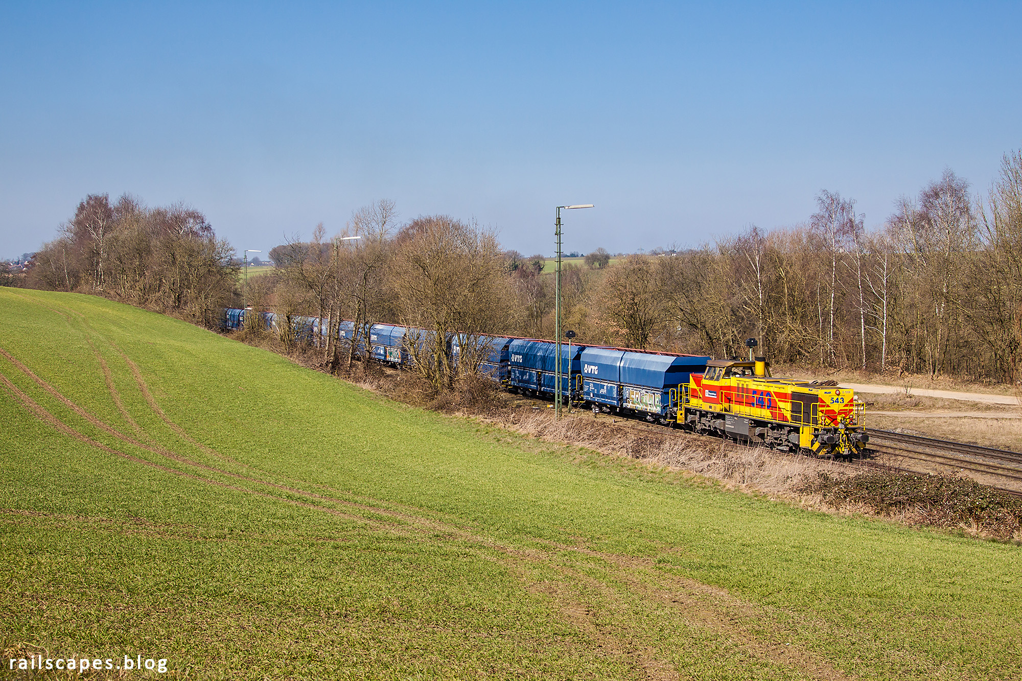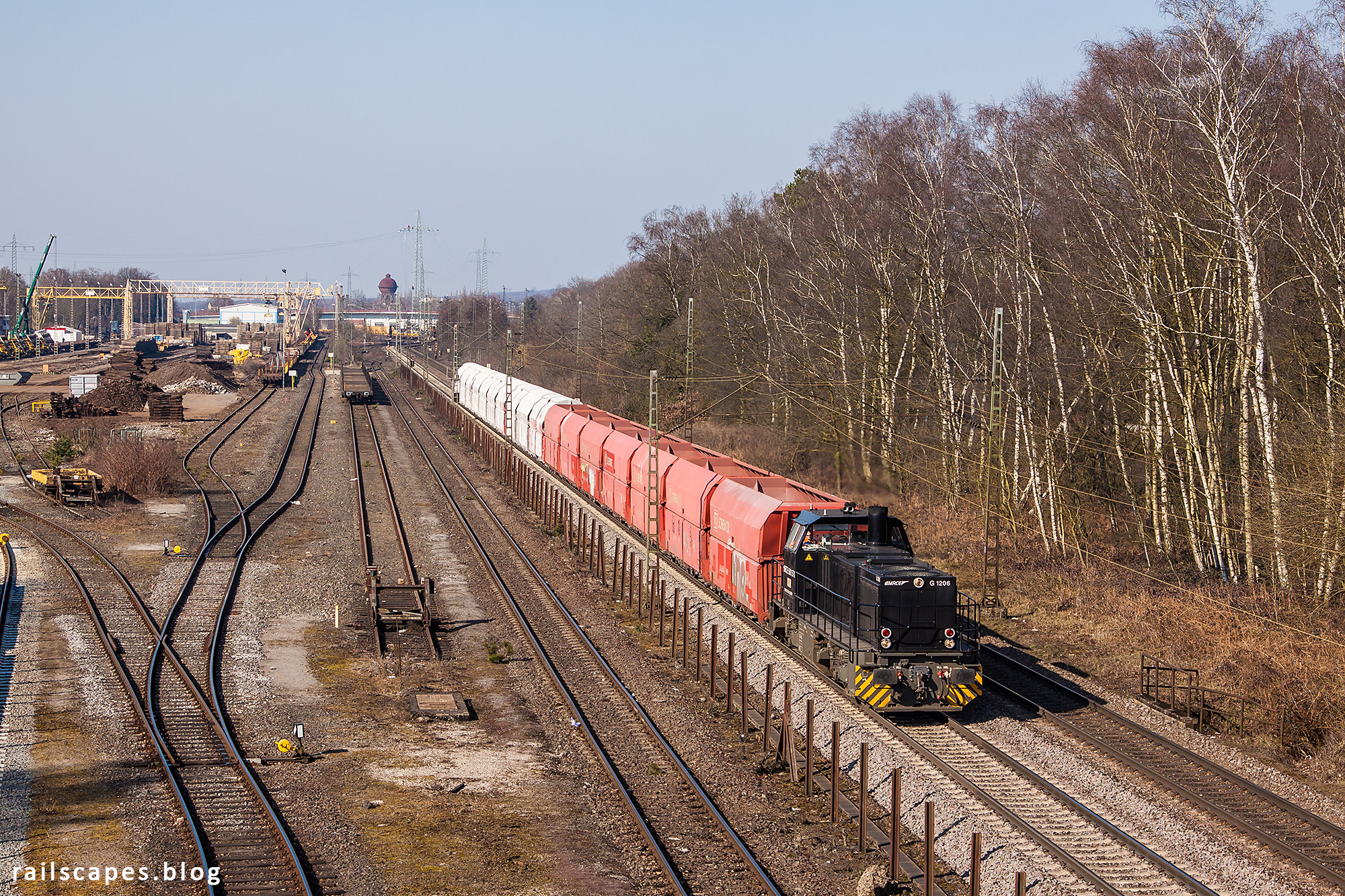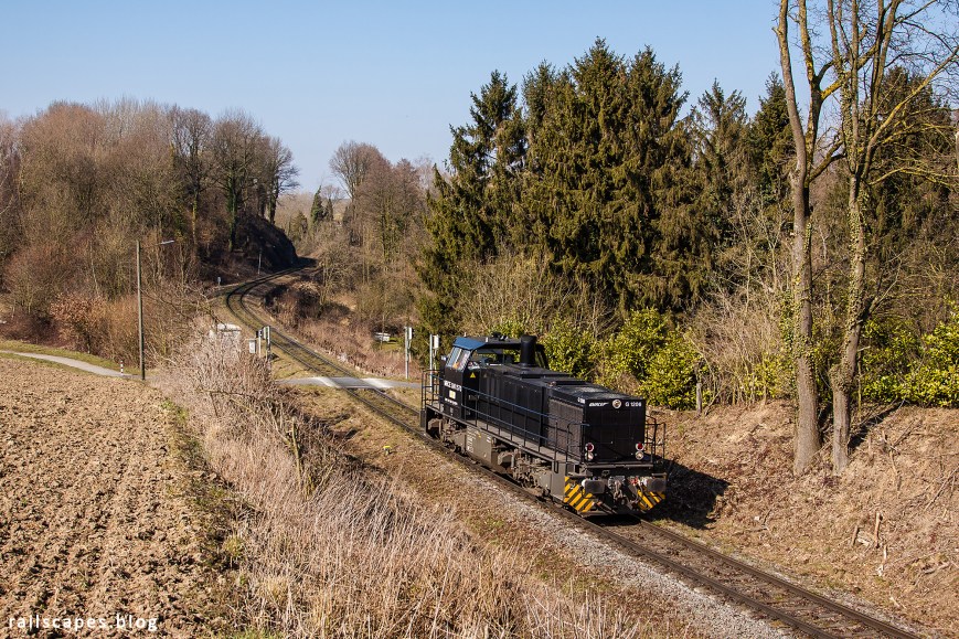 The Angertalbahn is a non-electrified line connecting Ratingen and Wülfrath. It doesn’t see passenger trains anymore since long, but there is still frequent freight traffic to the Rheinkalke lime factory. I didn’t have any knowledge of train times but decided to give it a try. Explore, discover photo opportunities and, who knows, see a train. In Flandersbach luck was already on my side: a train hauled by a G1206 owned by Eisenbahn & Häfen was about to leave the yard, towards the lime factory. I had barely enough time to set up and make a photo.