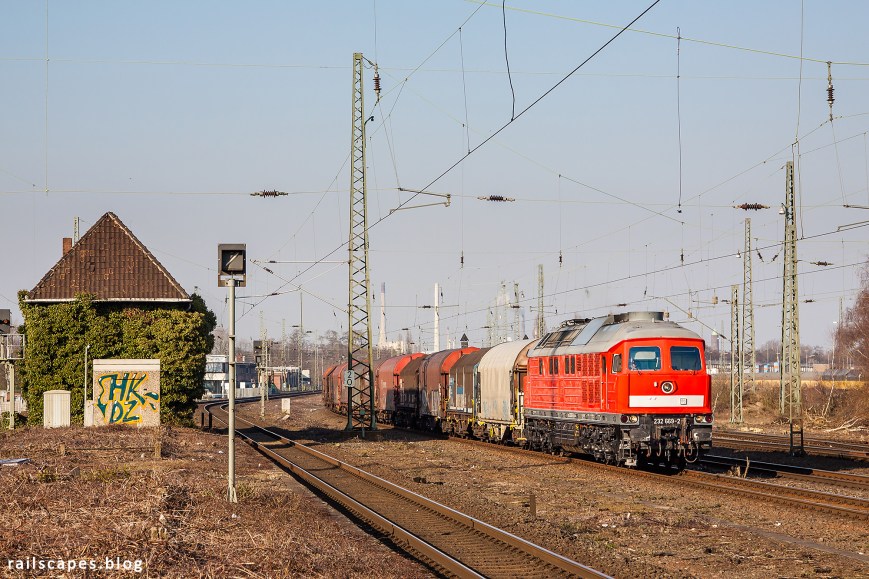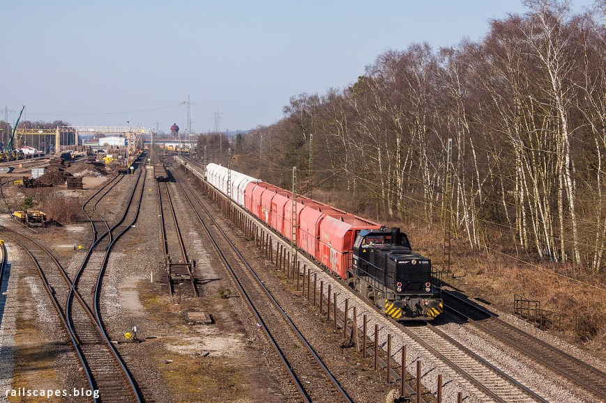 The last 2 visits I made to the Ruhr area tasted like… more. 5 days after the last visit, weather forecast looked really good. I got up early to be in the area at the creek of day. I had done some more research in the meanwhile and found out that the non-electrified line to the HKM factory sees quite a lot of traffic. I started the visit on a bridge overlooking the shunting yard of factory, where I could watch the continuous movement of trains delivering and picking up cars.