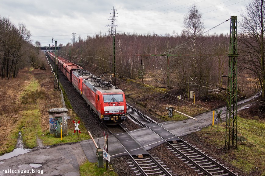 The Ruhr area is densely populated with not only people, but also train tracks. Difference is that population is probably increasing, and the number of tracks are probably decreasing. This photo is taken standing atop a bridge of a once active railway line. The line going underneath connects Oberhausen to the Dutch Betuwe route and thus sees a lot of traffic from the port of Rotterdam, mainly hauled by class 189 locomotives.