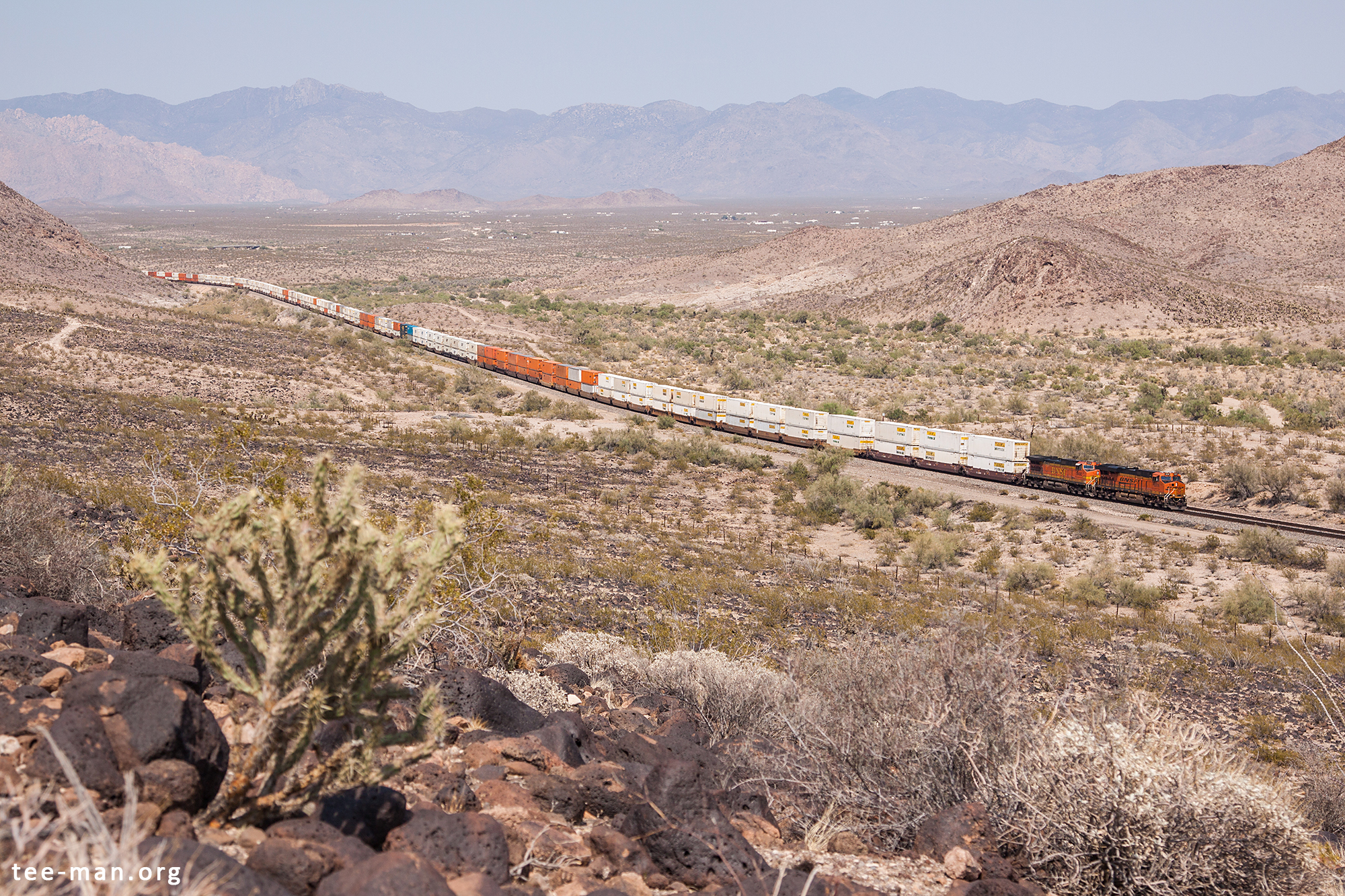 Between Needles and Kingman, both Interstate 40 and the BNSF transcontinental line run south and east of the Black Mountains. This mountain range stretches from Lake Mead in the North until the point that is shown here, at a place called Haviland, where a westbound container train runs along the southern part of the range. This zone is also called the Black Mesa.